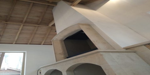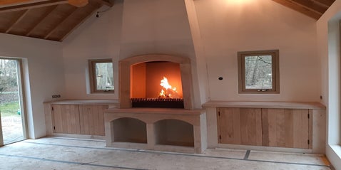 Grote zandstenen openhaard met eikenhouten kasten gerealiseerd
